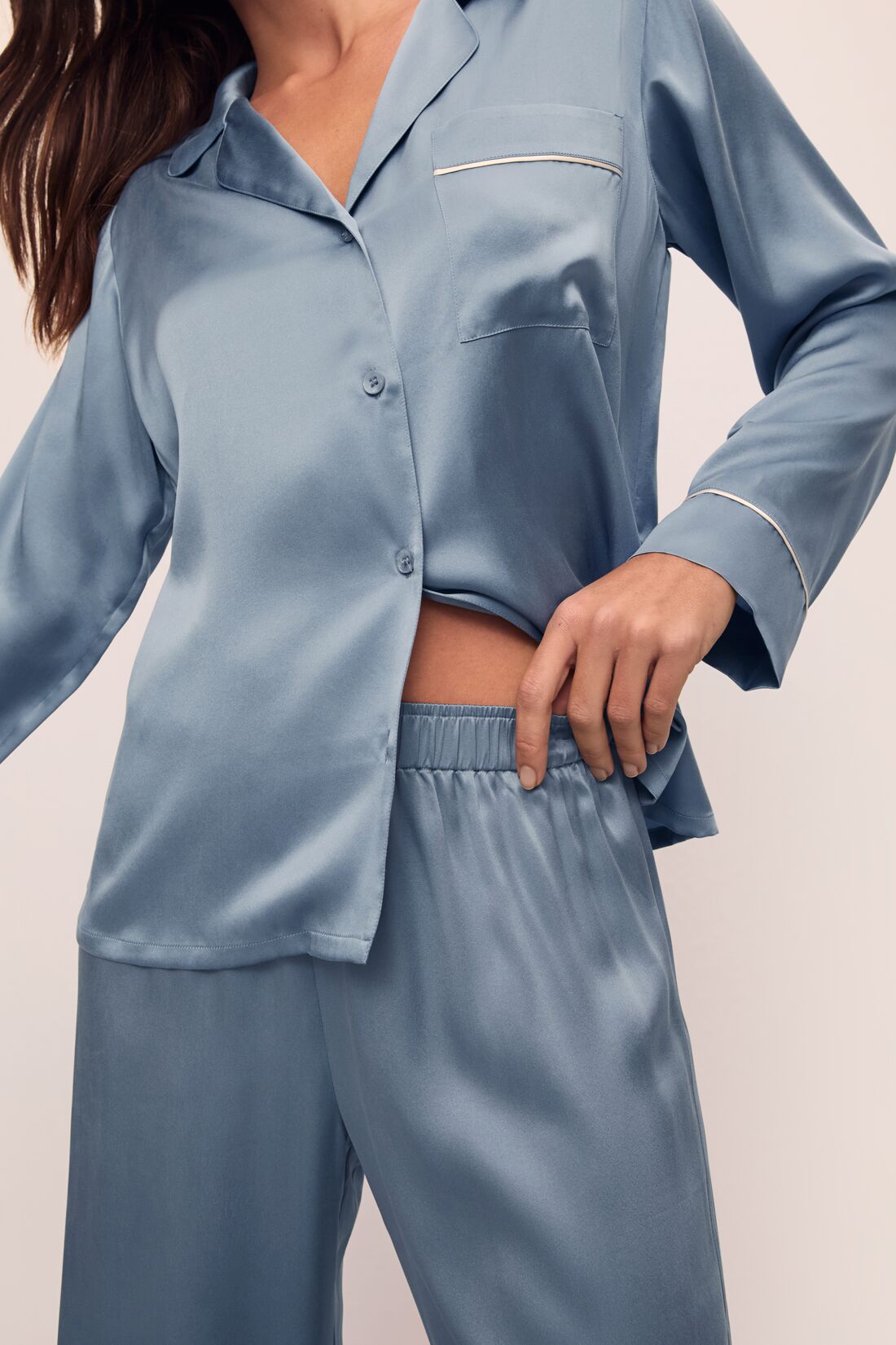 A dream to wear and a dream to wash. Made from 100% mulberry silk, our fabric is produced using bluesign®-certified processes and verified by OEKO-TEX® Standard 100, meaning it is processed without harmful chemicals or dyes in a mill that prioritizes safe and non-toxic practices. It’s hypoallergenic and thermoregulating, offering comfort year-round. This set features a relaxed long-sleeve button-up top with a notch collar and high-rise straight-leg pants with an elastic waistband. Pairs well with our everyday lingerie and Sherpa Slippers.